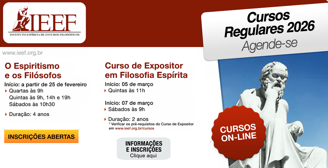 Informamos aos interessados nos cursos ministrados no IEEF, que as matrículas para o Curso Regular 1º ano: OEspiritismo e os Filósofos On-Line – Turmas de Agosto de 2025 estão ENCERRADAS. Clique aqui para ver... Leia mais